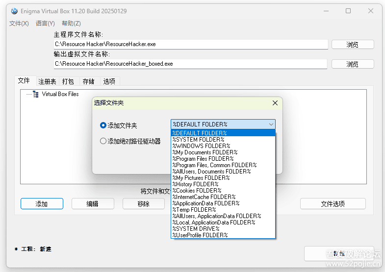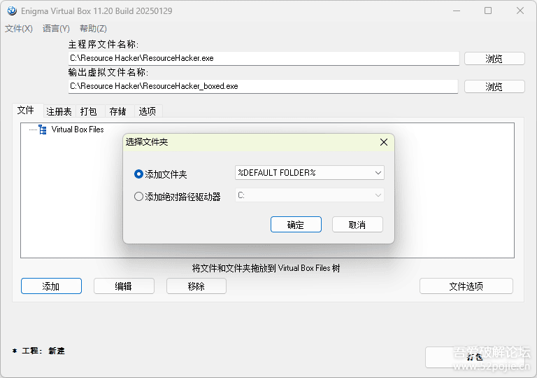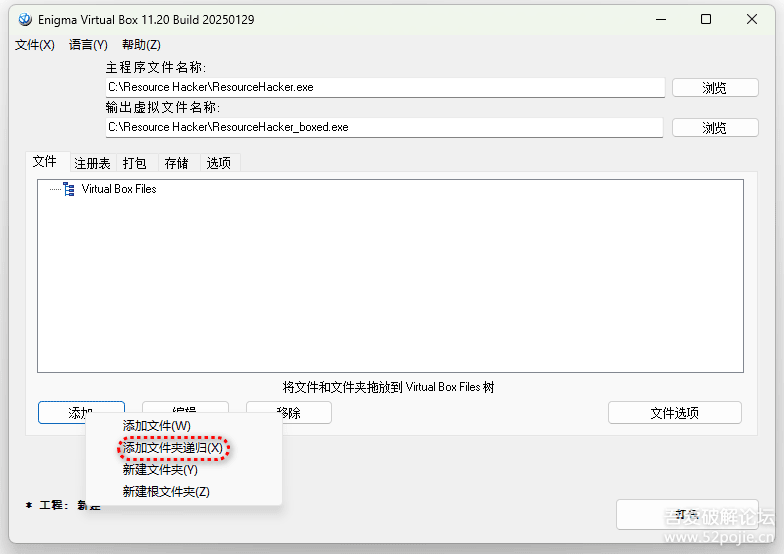 2. 點擊左下角的“添加”,選擇“增加文件夾遞歸”,選擇要制作成單文件版的綠色程序文件夾,如 C:\Resource Hacker\文件夾,然后就會出現(xiàn)一個彈窗,要你選擇虛擬文件夾目錄,一般選擇默認(rèn)的就可以