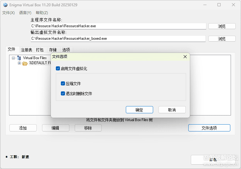 Enigma Virtual Box 虛擬文件打包功能并沒有對文件提供高強度的保護,如果您需要保護文件,建議您使用 Enigma Protector 完全版,其中已內(nèi)建了虛擬打包文件功能。
