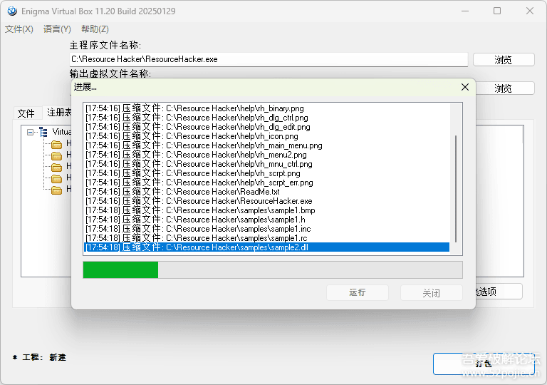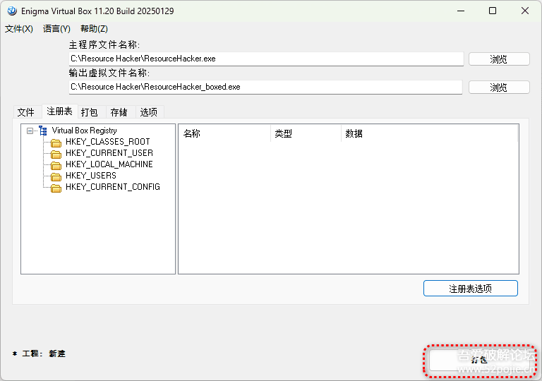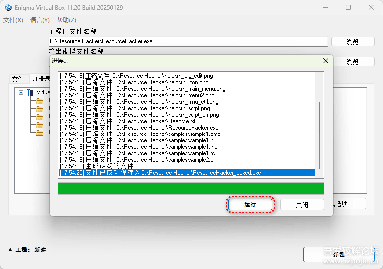5. 點擊“打包”,打包完畢后,制作出來的單文件程序ResourceHacker_boxed.exe默認(rèn)會和ResourceHacker.exe在相同的目錄,可點擊“運行”測試打包好的單文件程序