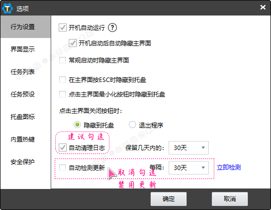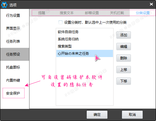 左上角可新建、按快捷鍵 Ctrl + Shift + O 可設置禁用自動更新、開機自啟、熱鍵、DIY主界面行為等等。雙擊某個任務可任意修改編輯,右鍵可呼出任務分類、轉(zhuǎn)復合任務等選項。托盤圖標可快速設置消息提醒、定時關機重啟等便捷任務。左上角可新建簡單或復合任務,總之怎么設置怎么來。