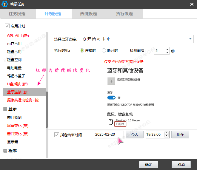 2. 觸發(fā)條件:系統(tǒng)資源占用(CPU、GPU、內(nèi)存、網(wǎng)速)、系統(tǒng)狀態(tài)(連接藍牙 / U盤、空閑時間、開機/休眠等)。另有定時、條件觸發(fā)、熱鍵觸發(fā)等觸發(fā)方式。