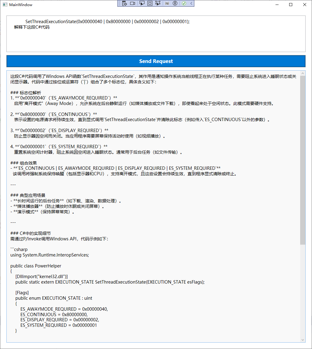 調(diào)用示例 private async void SendButton_Click(object sender, RoutedEventArgs e) { string requestText = RequestTextBox.Text; if (!string.IsNullOrWhiteSpace(requestText)) { try { string responseData = await DeepSeekHelper.CallDeepSeekAPI(requestText); // await new DeepSeekApi().CallDeepSeekAPI(chatRequest); ResponseTextBox.Text = responseData; } catch (Exception ex) { ResponseTextBox.Text = $"Error: {ex.Message}"; } } else { MessageBox.Show("Please enter a request."); } }