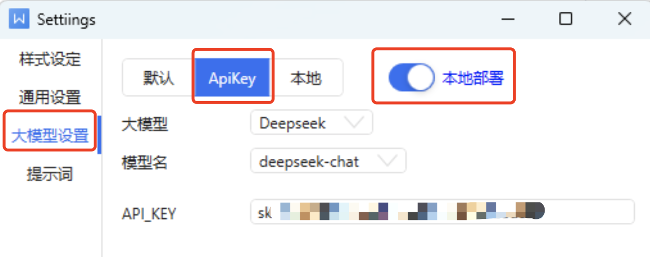 3. 配置OfficeAI插件 (3)在“設(shè)置”窗口中,選擇“大模型設(shè)置”,打開(kāi)“本地部署”開(kāi)關(guān),選擇“ApiKey”標(biāo)簽。 在“大模型”下拉菜單中選擇“Deepseek”,根據(jù)需求在“模型名”中選擇deepseek-chat(DeepSeek-V3)或deepseek-reasoner(DeepSeek-R1)。
