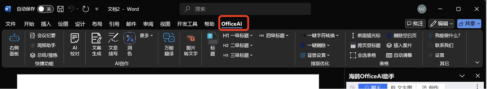 5、在Office的Word、Excel中使用deekseek的方法與上面的步驟相同,配置成功后會(huì)顯示“OfficeAI”選項(xiàng)卡。