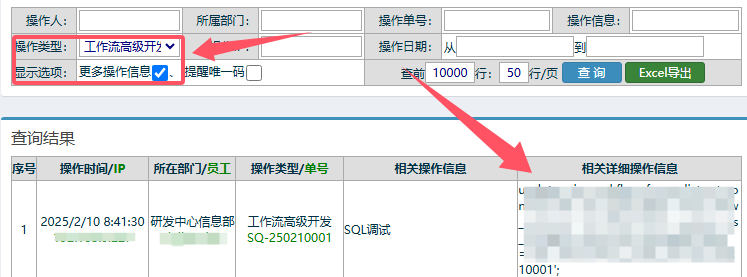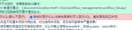 ![]() SQL沒有執(zhí)行可能是SQL語句出現(xiàn)錯(cuò)誤,可按以下方法調(diào)試。 模板中開啟顯示SQL: 審核完成后前往 設(shè)置-操作日志,選擇工作流高級(jí)開發(fā),勾選更多操作信息,可查看執(zhí)行SQL: 若顯示“SQL語句:xxxx”,則是正常執(zhí)行,若顯示“SQL錯(cuò)誤:xxxx”,代表執(zhí)行錯(cuò)誤。 注意,SQL是放在一個(gè)事務(wù)提交執(zhí)行的,若執(zhí)行后有報(bào)錯(cuò)則回滾。