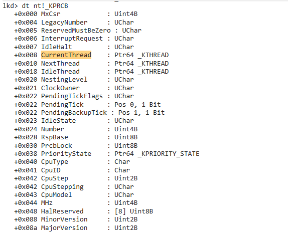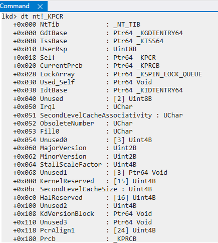 Windows會(huì)給每一個(gè) CPU核 分配一個(gè)_KPCR的內(nèi)存結(jié)構(gòu),用來(lái)記錄當(dāng)前CPU的狀態(tài)。并拓展了_KPRCB來(lái)記錄更多信息。