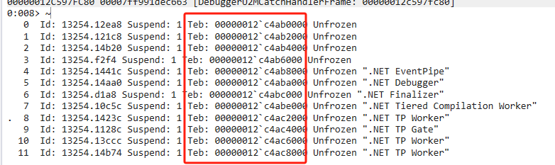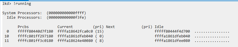 使用!running命令,可以看到當(dāng)前 CPU核 正在執(zhí)行的線程