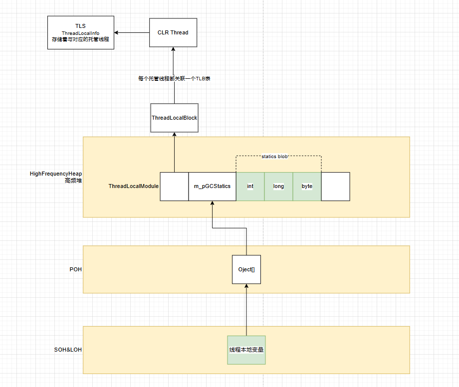 在.NET中,原生線程通過ThreadLocalInfo來(lái)關(guān)聯(lián)托管線程的mapping關(guān)系,托管線程關(guān)聯(lián)TLB(Thread Local lock)表,TLB再關(guān)聯(lián)TLM(Thread Local Module),TLM再關(guān)聯(lián)托管堆,托管堆中才是存儲(chǔ).NET TLS真正的地方。