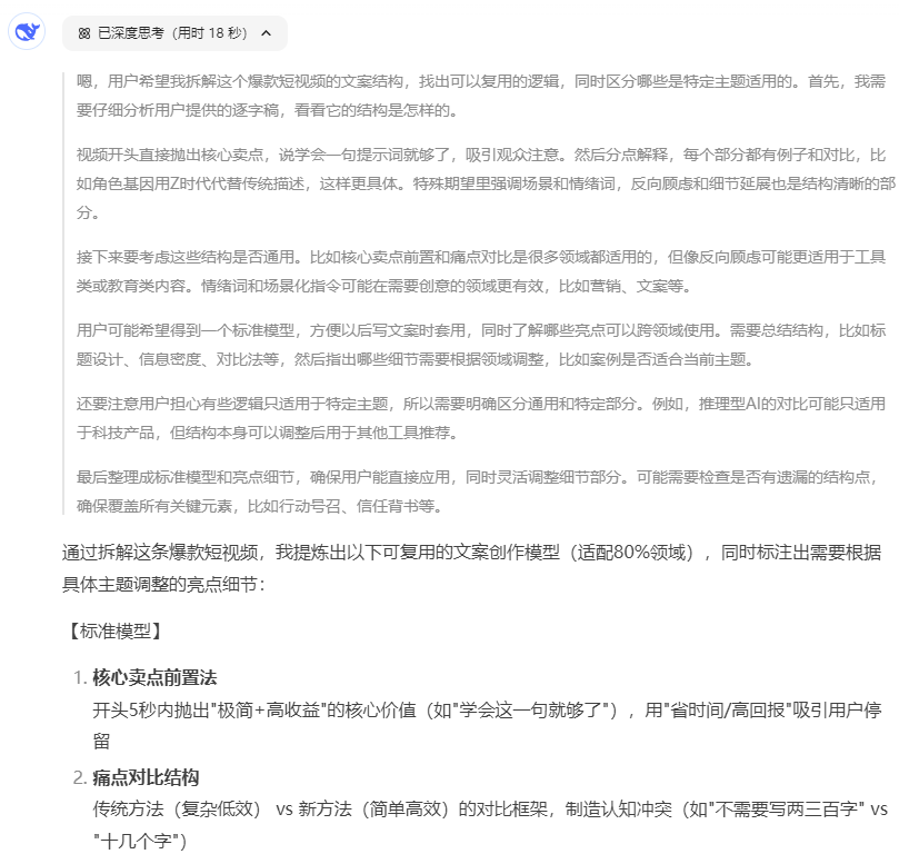 ,贊1.4萬 ![]() ![]() 吸睛文案:Deep Seek的提示詞,學(xué)會這一句就夠了。(①標(biāo)簽文案,指的是點(diǎn)名目標(biāo)用戶。但這條視頻,我沒有特別注明,因為我默認(rèn)所有人在這個時段都關(guān)注DeepSeek;②吸睛文案/黃金3秒:流量詞——DeepSeek,捷徑心理——學(xué)會一句就夠了) 牽制文案:這條極簡提示詞,一共十幾個字,一分鐘就可以搞定,點(diǎn)贊收藏,不管是IP寫內(nèi)容,還是打工人做策劃,都能讓你秒殺所有人,從外行變專家(這里有四點(diǎn):①多加一句話,拉完播,讓用戶更想聽完;②告知只有十幾個字,把學(xué)習(xí)門檻拉低;③提高覆蓋客群,IP和打工人都適用;④中間提醒點(diǎn)贊收藏;⑤最后包裝價值、展示收獲——秒殺所有人,從外行變專家) 觀點(diǎn)文案:這個提示詞就是:角色基因+特殊期望+反向顧慮+細(xì)節(jié)延展(①展示結(jié)構(gòu),讓用戶知道有1234個詞,如果對主題感興趣,不會聽個20秒就劃走;②直接給公式,滿足干貨感的同時,看得懂但不確認(rèn)細(xì)節(jié),想繼續(xù)聽;③熟悉又陌生,知道提示詞要寫角色、寫期望,那基因是啥、特殊是啥) 觀點(diǎn)1:角色基因,指的是我們不需要像以前傳統(tǒng)提示詞那樣,寫個兩三百字,比如你是一個有10年經(jīng)驗的寫作專家,專精于營銷領(lǐng)域,巴拉巴拉。而是要用一些帶有明確基因的專屬詞,比如比如00后、Z時代。(①對標(biāo)傳統(tǒng)AI,提供新知;②直接給操作方案,不復(fù)雜) 作證1:為什么?因為DeepSeek有豐富的語料庫,他知道什么叫Z時代,他知道他們的需求,他們的特點(diǎn),以及他們的風(fēng)格,這個就是角色基因。(給作證,不是我自己瞎說——語料庫) 觀點(diǎn)2:第二個是特殊期望,就是你不要寫給我一條奶茶店的營銷話術(shù),而是你能不能去發(fā)現(xiàn)一個特殊場景,以此去激發(fā)DeepSeek 的靈感和創(chuàng)意。比如給我寫一個讓00后會瘋狂轉(zhuǎn)發(fā)的、印在奶茶包裝上的文案。如果你能想到這樣的場景,把它放入你的特殊期望,你會發(fā)現(xiàn)它給你的答案會比傳統(tǒng)AI高個十倍百倍不止。(提供新知識——1個之前沒想到的問法:印在奶茶包裝上的文案) 這里還有一個關(guān)鍵技巧,就是不管是角色還是期望,你都一定要使用一些情緒詞,比如說讓寶媽尖叫的XXX,或者你是一個美妝行業(yè)的黑話專家,這些聽起來不太正經(jīng)的詞,在傳統(tǒng)AI里面可能是很少見的。(提供新知識:情緒詞——好記好用) 作證2:但DeepSeek很喜歡這些詞,因為它是基于思維鏈強(qiáng)化學(xué)習(xí),自動補(bǔ)全任務(wù)場景。(給作證,不是我自己瞎說——思維鏈) 金句:你給個線頭,它就能幫你織出整件毛衣!(金句加深印象,觸發(fā)點(diǎn)贊) 知識點(diǎn)3+作證3:接下來是反向顧慮,也就是你不想讓它干什么,或者你怕出現(xiàn)什么。因為DeepSeek 有非常強(qiáng)大的推理能力,所以他會從你的顧慮中去反向推斷,幫你排除所有錯誤答案。(給作證,不是我自己瞎說——推理能力) 知識點(diǎn)4+作證4:最后一個是細(xì)節(jié)延展,這個延展可以是輸出風(fēng)格,也可以是輸出形式,比如請用董宇輝的語氣給我寫一個直播稿,或者用執(zhí)行方案的形式輸出你設(shè)計的策劃內(nèi)容,DeepSeek都會給你一個驚艷的答案(簡單舉例,給用戶可以直接上手嘗試的方法) 案例:舉個簡單的例子:你是懂Z時代的心理咨詢師,要給被催婚的女生做科普,要讓她們理解婚姻不是必選項,但是也別讓家長覺得被冒犯,用韓劇《黑暗榮耀》臺詞風(fēng)格來寫(直接給案例,讓用戶能“直接抄”,同時用戶可能想再聽一遍,觸發(fā)完播) 結(jié)尾文案:其實簡單來說,傳統(tǒng)AI更像是你的一個員工,你要事無巨細(xì)的告訴他工作的每一步應(yīng)該如何處理,他才能輸出給你一個相對標(biāo)準(zhǔn)的答案,但是推理型的DeepSeek ,更像是一個24小時的咨詢顧問,你需要給的不是指令,而是精準(zhǔn)的描繪出你的需求場景,它會拆解你的問題,思考它背后的商業(yè)背景,然后進(jìn)行邏輯推演,最后從巨量的知識庫中找到答案。(①升華式結(jié)尾,從“操作方案”上升到“DeepSeek的定位”;②用金句+對比,在結(jié)尾畫龍點(diǎn)睛,讓用戶覺得有道理,增強(qiáng)對視頻的好感——該點(diǎn)贊了) 指令文案:所以,如果我們還在用原來那套提示詞,就是限制了它的發(fā)揮,快轉(zhuǎn)發(fā)給你最好的朋友、同事,一起用起來吧。(①新老AI對比,讓用戶覺得——原來如此;②發(fā)出指令,引導(dǎo)用戶轉(zhuǎn)發(fā)。很多時候你沒說,用戶就真的忘了轉(zhuǎn)發(fā)) 最后還有一點(diǎn),這個不是我刻意為之,但我確認(rèn)肯定有效果,就是:保留一些缺陷,讓用戶在評論區(qū)指出/討論。 1、我錄制這條視頻的時候,比較隨意,是手拿著錄的,所以畫面有各種抖動; 2、我上個月剛開的號,之前沒有短視頻剪輯的經(jīng)驗,背景音樂有點(diǎn)吵 這兩個點(diǎn),在評論區(qū)被很多人嘲諷。反而卻因為這些,與內(nèi)容本身無關(guān)的缺陷,引起了用戶的互動:有人表示同意,說我視頻很爛;有人幫我說話,說人家觀點(diǎn)好就可以了。 所以如果你能想到一些方式,讓用戶在評論區(qū)聊起來、甚至吵起來,也會對你的播放,有很大的影響。 還有一些文案之外的維度,比如:封面設(shè)計如何讓人看到就想點(diǎn)進(jìn)去(因為你的封面會出現(xiàn)在微信推薦和