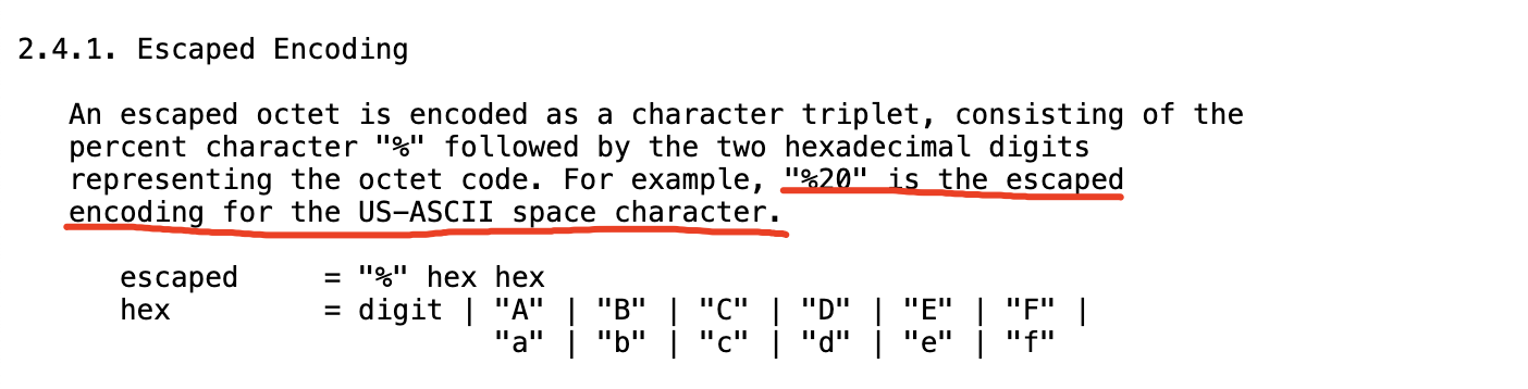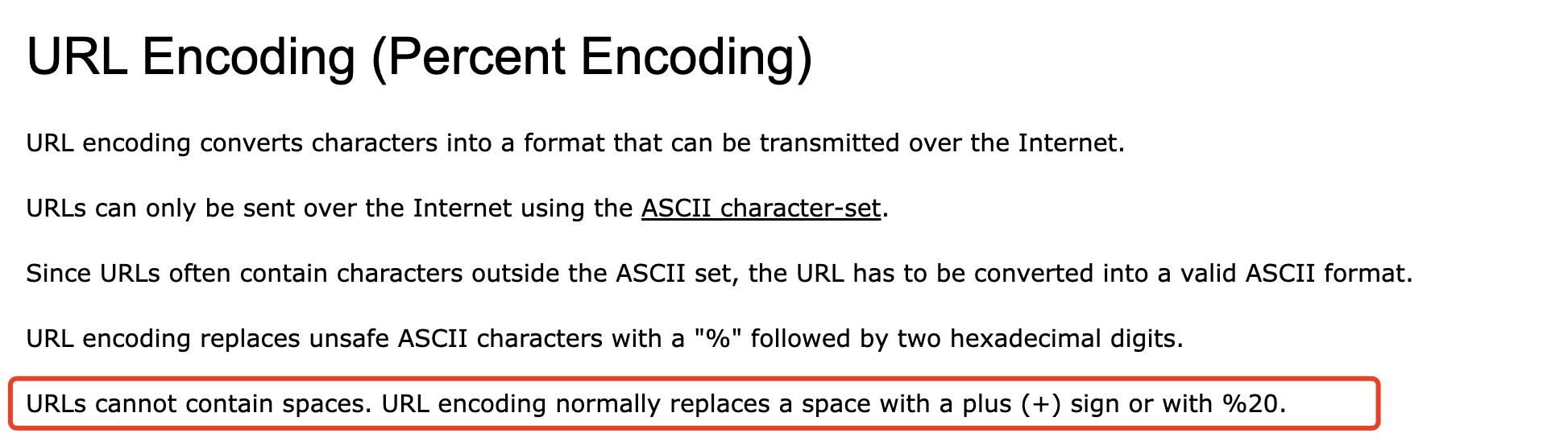 在RFC3986中提到:除了 數(shù)字 、 字母 、-_.~ 不會被轉(zhuǎn)義,其他字符都會被以百分號(%)后跟兩位十六進制數(shù) %{hex} 的方式進行轉(zhuǎn)義。在這個規(guī)則中空格會被轉(zhuǎn)為%20,而+會被轉(zhuǎn)為%2B