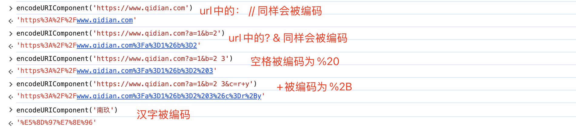 encodeURLComponent除了這些A-Z a-z 0-9 - _ . ! ~ * ' ( ) 不會被編碼,其余字符都會被編碼