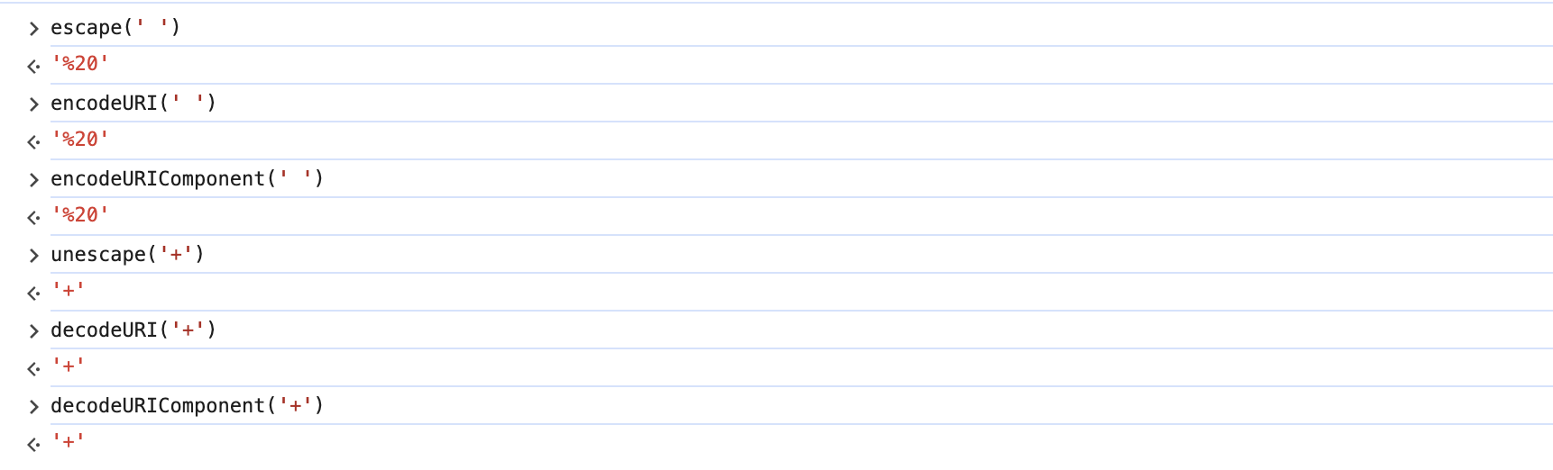 上面分別介紹了URL的編碼規(guī)范,以及前端編碼方法應(yīng)用的規(guī)范。總結(jié)下來就是空格不會在前端產(chǎn)生,前端應(yīng)用的編碼規(guī)范不會將空格編碼成+,也不會把+解碼成空格。