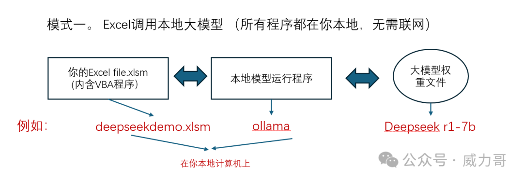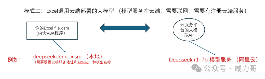 有了這個Excel 文件后,在文件的“Settings” sheet中配置后,用戶在問題格(黑色格)中輸入問題,點擊“發(fā)送”按鈕,依據(jù)你的模型運行速度,就可以很快在大模型回答格(淡藍色格)中看到答案。基本工作原理是Excel是支持使用VBA語言編程的。在這個Excel文件里面我用VBA寫了一個程序。這個程序來讀以下“settings” sheet中的模型地址和設(shè)置,然后根據(jù)地址來向大模型服務(wù)發(fā)送請求。 這個大模型服務(wù)可以是你本地部署的ollama,也可以是你注冊的其它大模型云端服務(wù)。云端服務(wù)需要從服務(wù)商獲得API KEY,并設(shè)置在Settings sheet中的相應(yīng)格子中,本地部署的不用API KEY,你就隨便寫一個就好。模式一。全部程序都在本地,無需聯(lián)網(wǎng)。模型一需要本地部署ollama,教程在前面我的微信號中。模式二。 你的Excel 去調(diào)用遠程的云端大模型服務(wù),需要去找個大模型云端服務(wù)商進行注冊,并獲得地址和API Key本文主要是介紹如何構(gòu)建這個deepseekdemo.xlsm Excel 文件。 具體構(gòu)建這個Excel文件只需要五步,就可以在文件中調(diào)用Deepseek 模型了!步驟1. 打開Excel 的開發(fā)工具窗口。 步驟4. 在worksheet “Settings” 中設(shè)置模型地址和模型名稱參數(shù)。 步驟5. 創(chuàng)建發(fā)送按鈕。保存Excel完成五個步驟后,回到第一個Sheet,輸入你的問題,就可以看到前面的效果了。