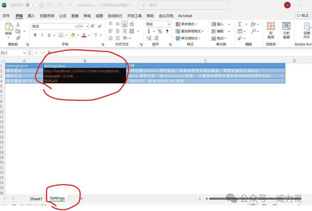 因為我在程序中使用了命名的Range,需要先設(shè)置幾個Range 名字。 3.1 增加一個“Settings”的sheet。 名字一定要叫“Settings"3.2. 在settings zhong,輸入以下三行信息(黑色背景)。 把這三個cell分別命名成“Named Range” 名稱為:pmodelurl, pmodelname,pmodelapikey不知道什么叫“Named Range", 去查Excel 文檔。 3.3. 回到Sheet1, 在Sheet1中按照下面布局輸入。3.4 然后將問題部分命名”Named Range“ 名字為: puserquery. 把大模型回答cell命名為:pllmanswer. 命名完成后,在下圖位置下拉可以看到這幾個“Named Range”步驟4. 在worksheet “Settings” 中設(shè)置模型地址和模型名稱參數(shù)。 點擊“Settings” sheet, 保證這三個參數(shù)是正確的。