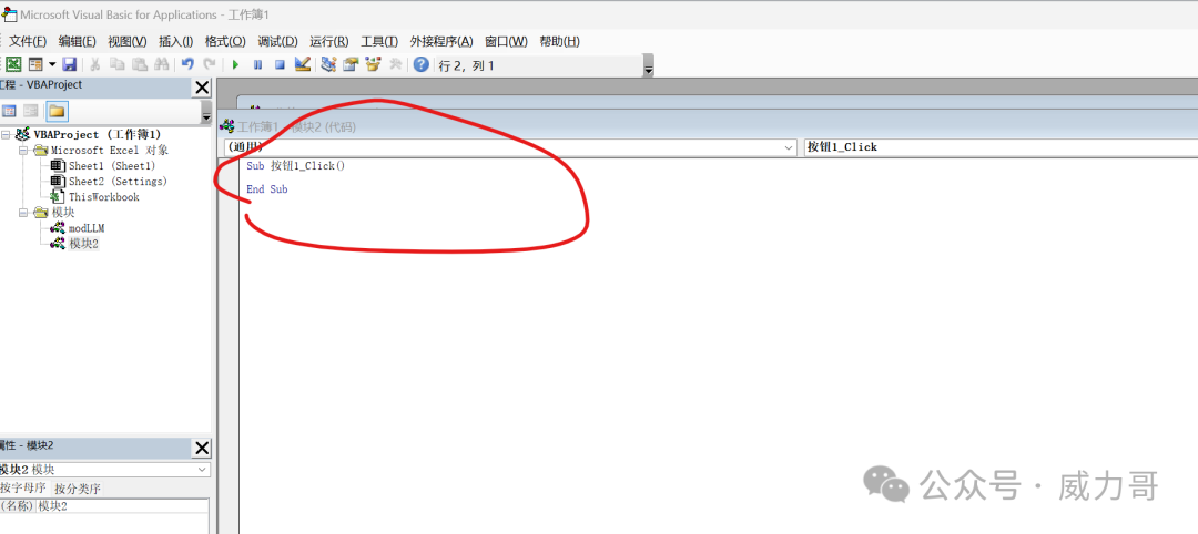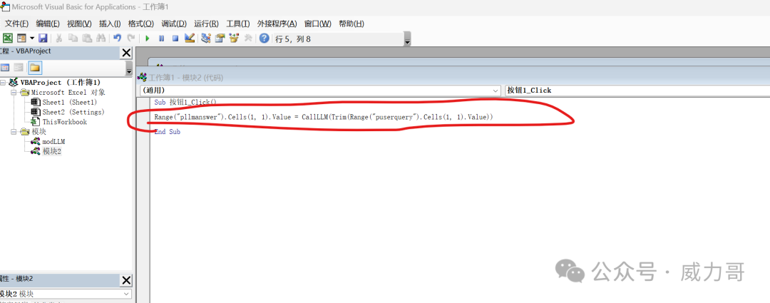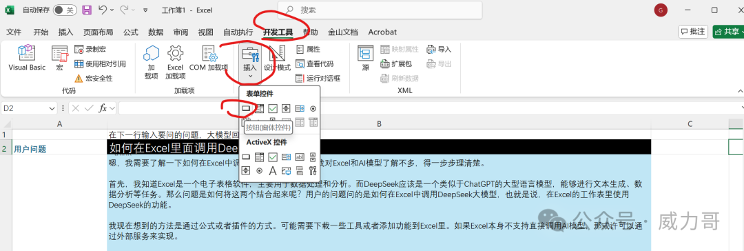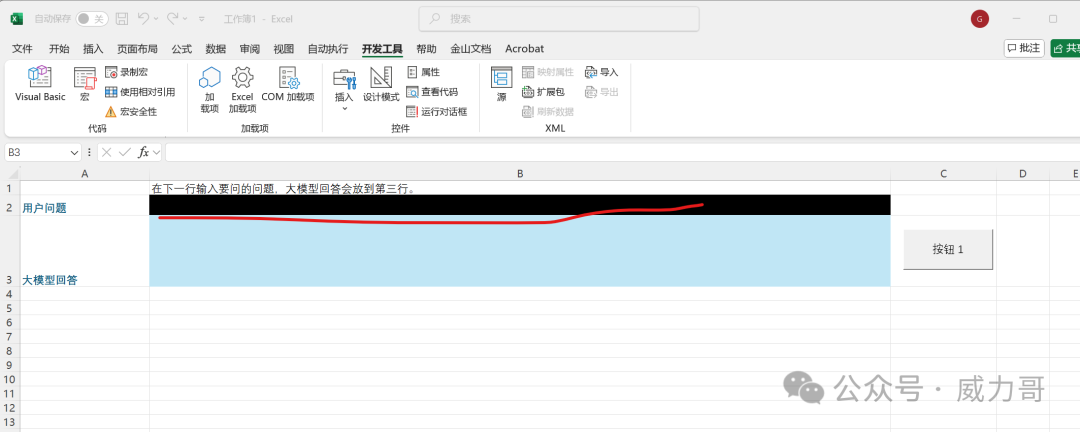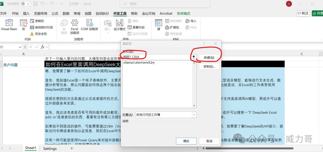 ? 模式一。 本地部署ollama的,這里你只需要改一個地方:模型名稱改到你的ollama支持的模型名稱。 模型名字一定要匹配ollama的。 那你可以輸入哪些具體模型名字呢?在命令行,輸入:ollama list模式二。使用云端大模型服務(wù)的, 你需要從云服務(wù)商獲得模型地址和模型API key,和支持的模型名稱。輸入這三個。 步驟5. 創(chuàng)建發(fā)送按鈕。保存Excel5.1 在sheet1 中,找到”開發(fā)者工具“菜單,點擊添加按鈕。 鼠標(biāo)變成十字星,選擇在C2 cell位置畫一下,就會彈出這樣的宏窗口。 5.2 點擊“新建”。 出現(xiàn)宏編輯窗口。 Range("pllmanswer").Cells(1, 1).Value = CallLLM(Trim(Range("puserquery").Cells(1, 1).Value))