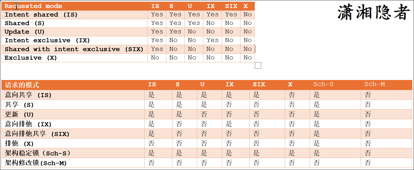 從上面實(shí)驗(yàn)可以看出,在 SQL Server 中,更新統(tǒng)計(jì)信息可能會(huì)申請持有很多類型的鎖,那么我來一項(xiàng)項(xiàng)分析,在分析之前,我們來看一下鎖的兼容矩陣,如果對這方面知識有點(diǎn)模糊不清的,正好可以重溫一下這方面的知識點(diǎn):