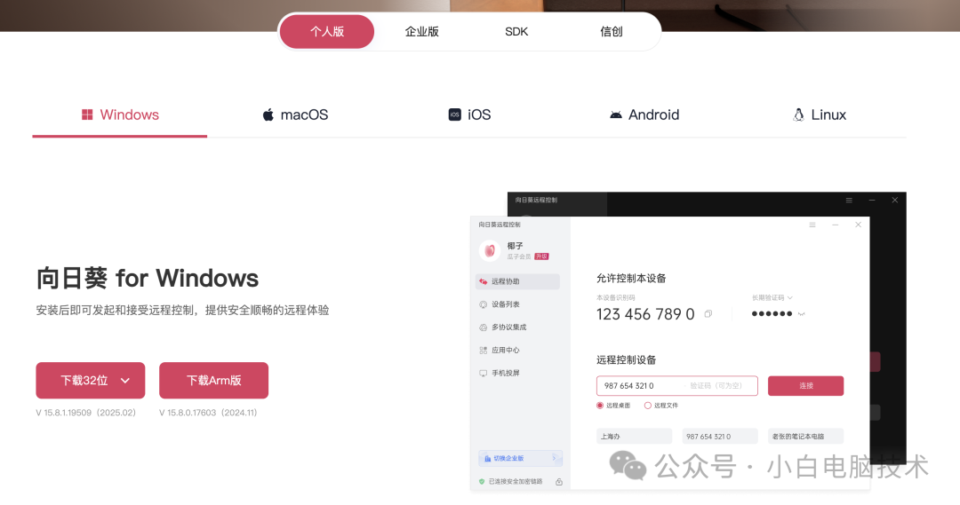 接著在你操作的電腦B下載安裝個人版本的向日葵