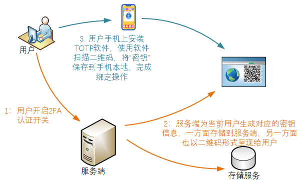 用戶(hù)密鑰因子是服務(wù)端為用戶(hù)生成的授權(quán)密鑰,計(jì)算生成驗(yàn)證碼的時(shí)候,服務(wù)端和客戶(hù)端都要使用同一個(gè)密鑰進(jìn)行計(jì)算,所以服務(wù)端為用戶(hù)生成密鑰后,除了服務(wù)端要保存該密鑰與用戶(hù)的綁定關(guān)系,還需要將此密鑰提供給用戶(hù)、由用戶(hù)將其綁定到手機(jī)上的TOTP軟件中(所謂綁定,本質(zhì)上就是將服務(wù)端生成的密鑰存儲(chǔ)到手機(jī)的TOTP軟件中)。綁定完成后,服務(wù)端和客戶(hù)端就都擁有相同的用戶(hù)密鑰信息了。