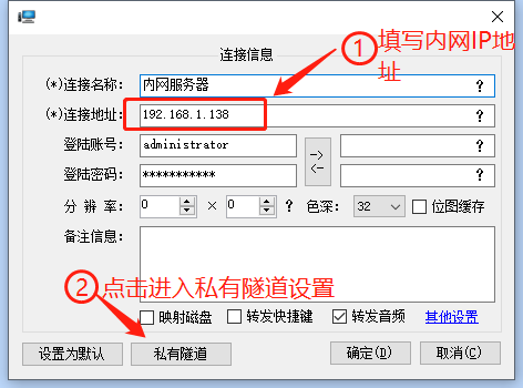 三、 專業(yè)高級功能3.1 私有隧道配置1. 某些局域網(wǎng)絡(luò)會(huì)設(shè)置只有其中一臺(tái)PC可以聯(lián)網(wǎng),其他PC不能上網(wǎng)的情況,這種情況下需要在能上網(wǎng)的這臺(tái)PC上安裝無人值守,具體方法參考2.2章節(jié)或2.3章節(jié) 2. 在主控端添加PC時(shí),應(yīng)該在連接地址處填寫被控端的局域網(wǎng)IP地址,如下圖: