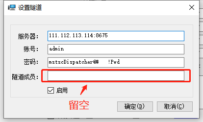 4. 在私有隧道中填寫A服務(wù)器被映射的外網(wǎng)端口、賬號、密碼并勾選啟用,注意在隧道成員框留空,如下圖: