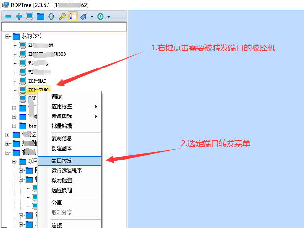 3.4 端口轉(zhuǎn)發(fā)有的時(shí)候被控機(jī)沒有外網(wǎng)端口,但是又要急切地在主控機(jī)上訪問被控機(jī)的某個(gè)端口時(shí),可以使用這個(gè)功能,注意:這個(gè)功能需要被控機(jī)是使用無人職守模式連接,或者安裝了私有隧道才支持。 1. 選定需要被轉(zhuǎn)發(fā)端口的被控機(jī),如下圖所示:
