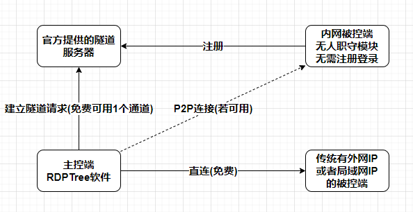 RDPTree使用教程 一、 簡介RDPTree直接封裝了系統(tǒng)自帶的遠(yuǎn)程桌面功能。一般的遠(yuǎn)程桌面軟件都是通過截圖的方式傳輸畫面,而系統(tǒng)自帶的遠(yuǎn)程桌面實(shí)際上只傳輸繪制操作,所以對網(wǎng)絡(luò)帶寬的要求相比其他同類軟件較低,同時(shí)性能和體驗(yàn)會(huì)好很多,而RDPTree在這個(gè)基礎(chǔ)上增加了內(nèi)網(wǎng)穿透、批量控制、端口映射等比較復(fù)雜的功能,并且做了封裝,同時(shí)滿足了傳統(tǒng)服務(wù)器和沒有固定IP的內(nèi)網(wǎng)PC的遠(yuǎn)程需求,更多詳情可以到官網(wǎng)查看: http://rdptree.com/。