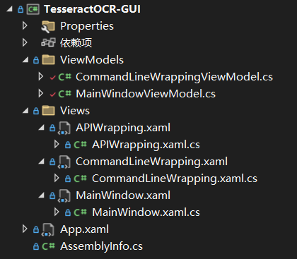 使用非常簡單方便。 WPF/C#程序員使用經(jīng)過簡單的調(diào)研,發(fā)現(xiàn)構(gòu)建TesseractOCR-GUI主要可以通過兩種方式。一種就是對命令行的使用進行封裝,另一種就是對TesseractOCR的C++ API進行封裝。 對命令行的使用進行封裝比較簡單,而且目前暫時也滿足了我的使用需求,因此目前只實現(xiàn)了這種方式,pytesseract好像也是使用的這種方式。第二種調(diào)用Tesseract C++ API的方式,可能得等第一種對命令行的使用進行封裝無法滿足需求的時候,才會去探索了。 項目結(jié)構(gòu):
