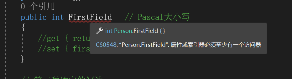 ? 只讀和只寫屬性要想不定義屬性的某個(gè)訪問器,可以忽略該訪問器的聲明。 只有g(shù)et訪問器的屬性稱為只讀屬性。只讀屬性是一種安全的,把一項(xiàng)數(shù)據(jù)從類或類的實(shí)例中傳出,而不允許太多訪問方法。 只有set訪問器的屬性稱為只寫屬性。只寫屬性是一種安全的,把一項(xiàng)數(shù)據(jù)從類的外部傳入類,而不允許太多的訪問的方法。 兩個(gè)訪問器至少有一個(gè)必須定義,否則編譯器會(huì)報(bào)錯(cuò),如下圖所示: