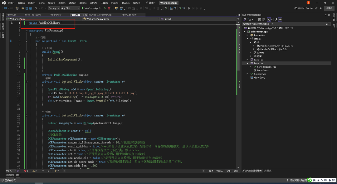 ?private PaddleOCREngine engine;private void button1_Click(object sender, EventArgs e){ OpenFileDialog ofd = new OpenFileDialog(); ofd.Filter = "*.*|*.bmp;*.jpg;*.jpeg;*.tiff;*.tiff;*.png"; if (ofd.ShowDialog() != DialogResult.OK) return; this.pictureBox1.Image = Image.FromFile(ofd.FileName);}