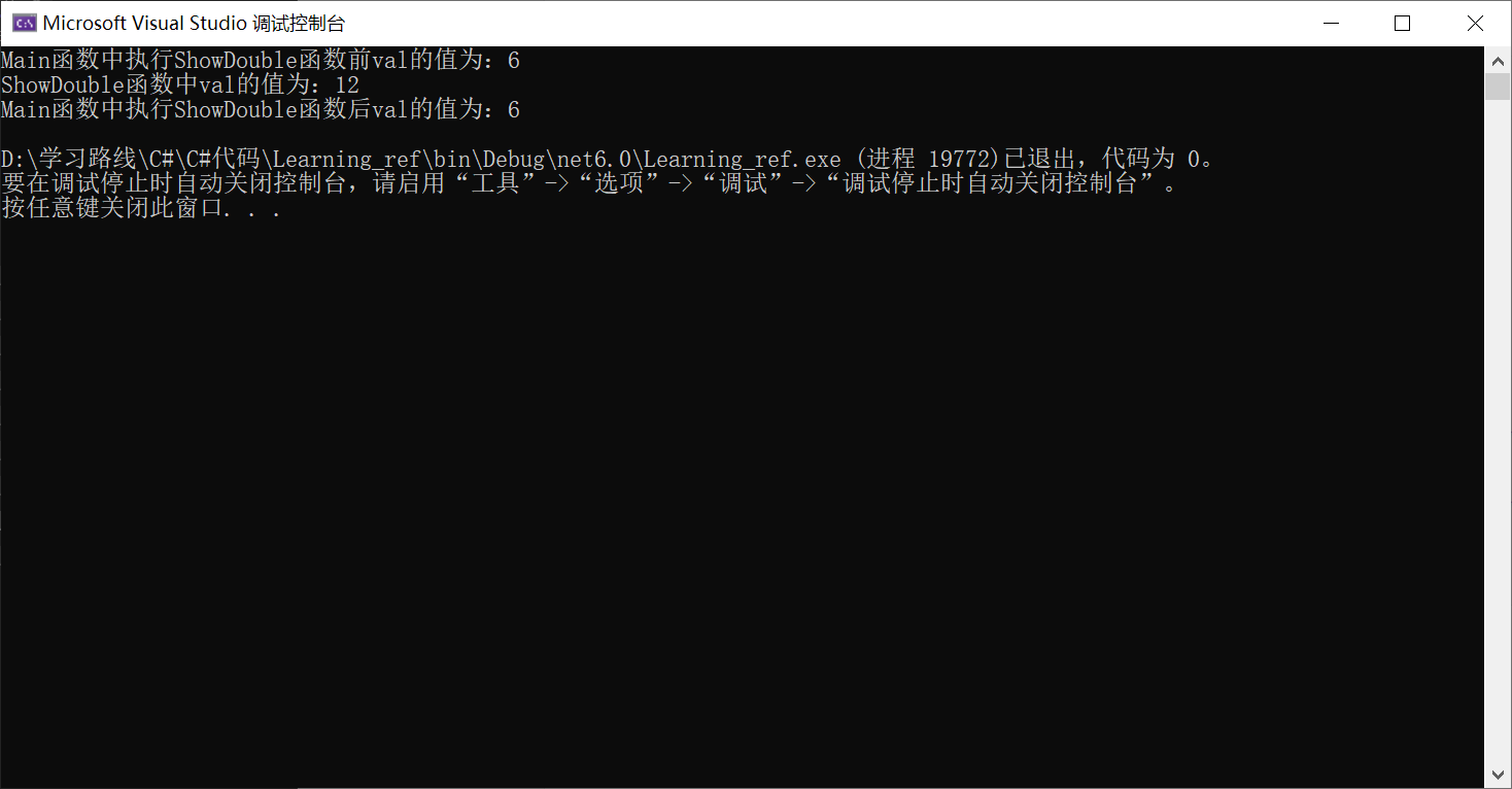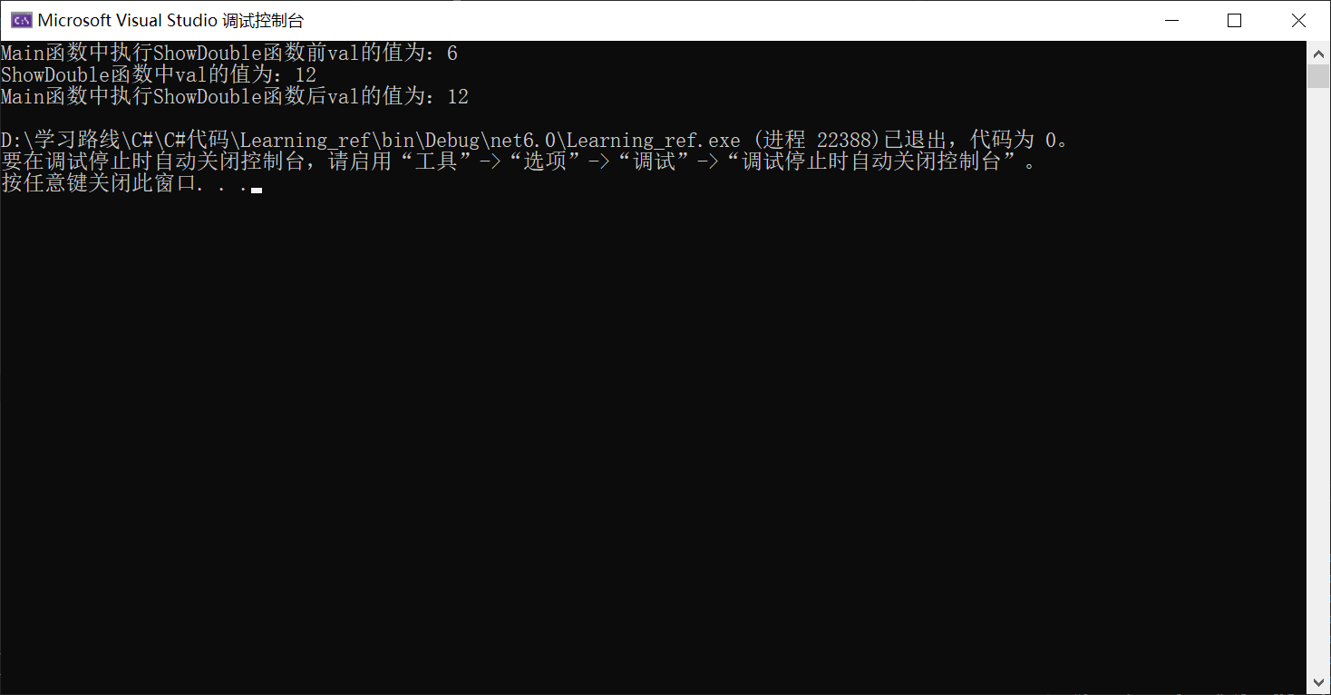 把val作為一個參數(shù),調(diào)用ShowDouble()并不影響Main()中val的值 那么如何改變val的值呢? 可以使用一個含返回值的函數(shù) 代碼如下所示: 運行結(jié)果,如下所示: