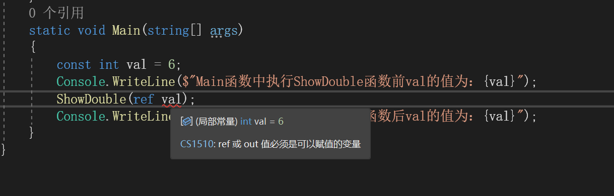 要注意,不僅在函數(shù)的聲明中要使用ref指定參數(shù),如代碼 static void ShowDouble(ref int val)所示,在函數(shù)的調(diào)用中,也要再次指定它,如代碼 ShowDouble(ref val)所示。 使用ref的限制1、函數(shù)可能會改變引用參數(shù)的值,所以必須在函數(shù)調(diào)用中要使用“非常量”變量 const int val = 6;這種寫法,編譯器會報錯,如下圖所示: