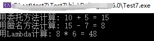 using System;using System.Linq;delegate int MathOperation(int a, int b);class Calculator{ public int Add(int a, int b) { return a + b; } public int Subtract(int a, int b) { return a - b; }}class Program{ static void Main(string[] args) { Calculator calculator = new Calculator(); MathOperation operation1 = calculator.Add; int result1 = operation1(10, 5); Console.WriteLine($"用委托方法計(jì)算: 10 + 5 = {result1}"); Func<int,int,int> operation2 = delegate (int a, int b) { return a - b; }; int result2 = operation2(15, 7); Console.WriteLine($"用匿名方法計(jì)算: 15 - 7 = {result2}"); Func<int,int,int> operation3 = (a, b) => a * b; int result3 = operation3(8, 6); Console.WriteLine($"用Lambda計(jì)算: 8 * 6 = {result3}"); Console.ReadKey(); }}
