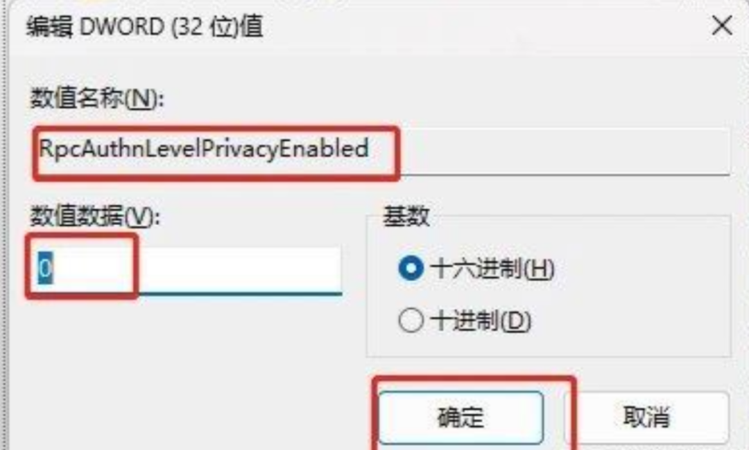 4、再將它重命名為:"RpcAuthnLevelPrivacyEnabled",然后雙擊打開(kāi)修改數(shù)值為“0”。重啟打印主機(jī)。