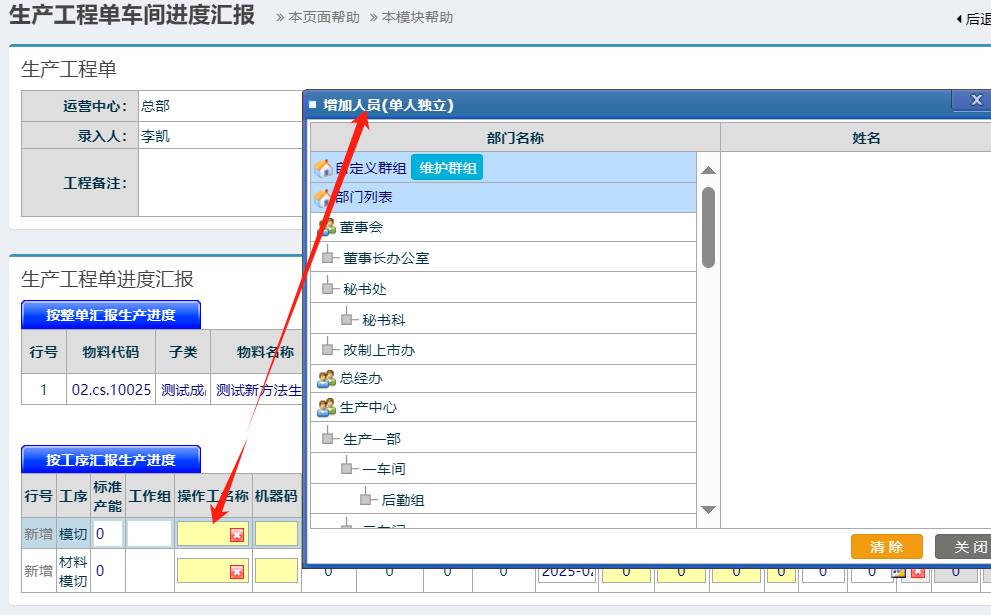 工藝資料的生產(chǎn)模式為單人獨(dú)立時(shí),生產(chǎn)匯報(bào)時(shí)的操作人只能選一個(gè) 如下圖: