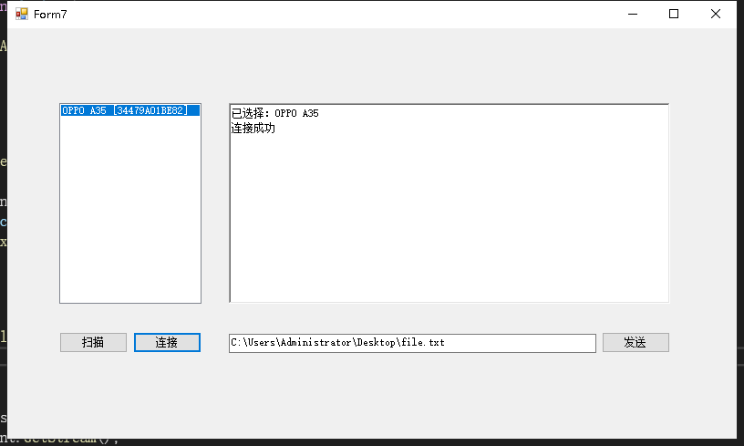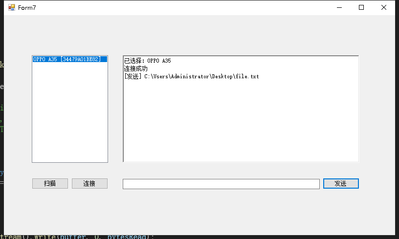 private void btnSend_Click(object sender, EventArgs e){ if (btClient?.Connected != true) return; byte[] buffer = new byte[1024]; using (FileStream fs = new FileStream(txtSend.Text, FileMode.Open, FileAccess.Read)) { int bytesRead; while ((bytesRead = fs.Read(buffer, 0, buffer.Length)) > 0) { btClient.GetStream().Write(buffer, 0, bytesRead); } } richTextBox1.AppendText($"[發(fā)送] {txtSend.Text}\n"); txtSend.Clear();}