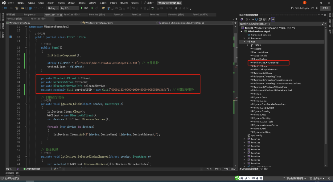 private BluetoothClient btClient;private NetworkStream btStream;private BluetoothDeviceInfo selectedDevice;private readonly Guid serviceUUID = new Guid("00001132-0000-1000-8000-00805f9b34fb");