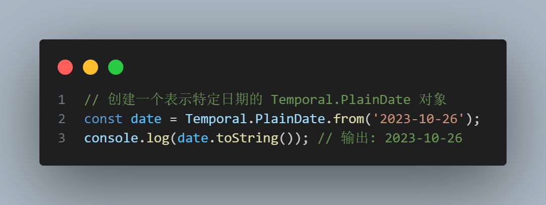 Temporal.PlainDate表示一個日歷日期,例如 "2023-10-26"
