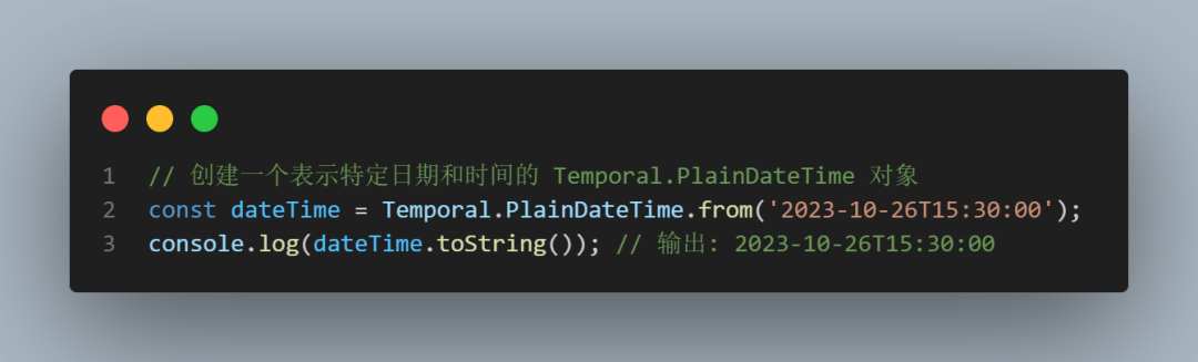 Temporal.PlainDateTime表示一個日歷日期和時間,例如 "2023-10-26T15:30:00"