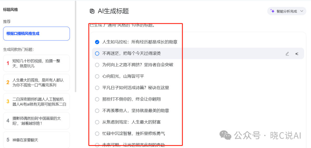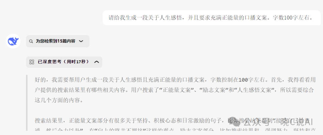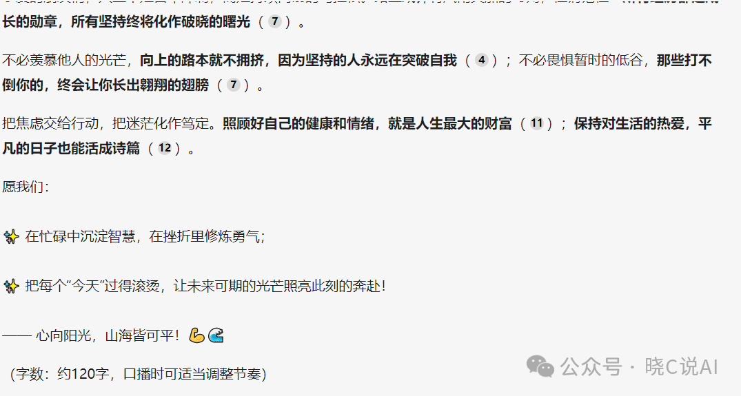 1.打開DeepSeek,讓DS幫我們生成口播文案。輸入提示詞:請給我生成一段關(guān)于人生感悟,并且要求充滿正能量的口播文案。字?jǐn)?shù)100字左右。2.打開納米AI,輸入:納米制作AI視頻,會(huì)出現(xiàn)以下界面。這里設(shè)置如下:選擇風(fēng)格、鉤子、時(shí)長等。時(shí)長可以拖動(dòng),比如拖動(dòng)10分鐘、20分鐘等。自己根據(jù)需求調(diào)整即可。并在右邊輸入DS生成的口播文案。單擊下一步,AI會(huì)自動(dòng)生成標(biāo)題,是不是很方便呢?到下一步后,可以選擇數(shù)字人形象。支持:自定義形象和推薦形象兩種。友情提示:在該步驟要記得勾選“嵌入字母”,這樣在視頻中會(huì)顯示口播對應(yīng)的字母。等設(shè)置好后,單擊“導(dǎo)出視頻”按鈕,稍等幾分鐘后即可生成視頻并下載保存到本地。此次生成的口播視頻我已經(jīng)上傳到視頻號(hào)里面,大家可以看下,歡迎您留言、點(diǎn)贊、評論、關(guān)注和轉(zhuǎn)發(fā),感謝!大家伙趕快試下吧,如遇到問題請留言給我,我們第一時(shí)間溝通。謝謝!