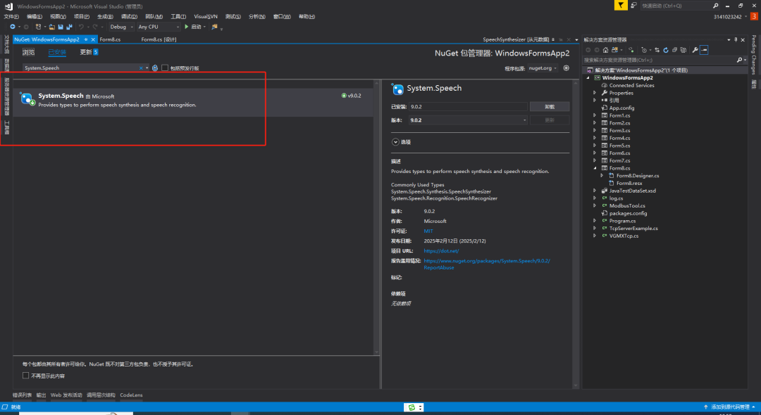 二、VS2022nuget安裝界面設(shè)計(jì)?三、代碼實(shí)現(xiàn)引用using System.Speech.Synthesis;語音播放private void SpeakAsync(){ // 創(chuàng)建一個語音合成器實(shí)例 using (SpeechSynthesizer synthesizer = new SpeechSynthesizer()) { synthesizer.Rate = 0;//速度 synthesizer.Volume = 100; // 可選:設(shè)置語音的語言和性別 synthesizer.SelectVoice("Microsoft Huihui Desktop"); // 例如,中文女性語音 // synthesizer.SelectVoice("Microsoft Zira Desktop"); // 例如,英文男性語音 // 要播放的文本 string textToSpeak = richTextBox1.Text;//"你好,世界!"; // 示例文本 // 播放語音 synthesizer.Speak(textToSpeak); // 等待語音播放完成(可選) synthesizer.SpeakCompleted += (s, e) => Console.WriteLine("語音播放完成!"); }}