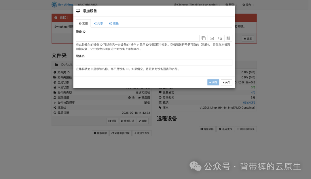 訪(fǎng)問(wèn) http://<host_ip>:8384,按裸機(jī)部署方式配置同步文件夾和添加設(shè)備。
