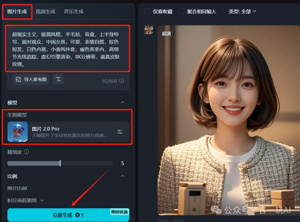 操作步驟: 第一步:圖片生成 首先打打開(kāi)即夢(mèng)官網(wǎng):https://jimeng.jianying.com/ 首先打開(kāi)即夢(mèng)官網(wǎng),進(jìn)入圖片生成頁(yè)面,選擇圖片生成,在方框里填入提示詞:超現(xiàn)實(shí)主義,極簡(jiǎn)風(fēng)格,羊毛氈,盲盒,上半身特寫,面對(duì)觀眾,中國(guó)女孩,可愛(ài),表情自然,棕色短發(fā),白色內(nèi)搭,小香風(fēng)外套,暖色系室內(nèi),高細(xì)節(jié)光線追蹤,虛幻引擎渲染,8K分辨率,逼真皮膚紋理。 生圖模式選擇2.0Pro,生圖比例選3比4,點(diǎn)擊立即生成,從生成出來(lái)的四張圖片,選擇自己喜歡的一張,下載到電腦。