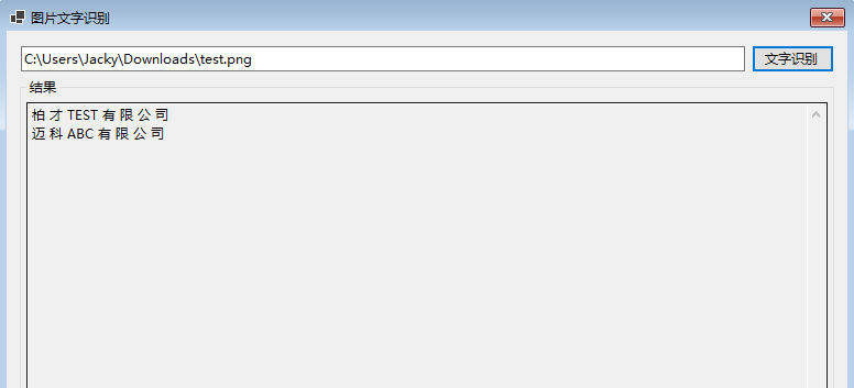 運行程序,輸入圖片路徑,點擊 "文字識別" 按鈕,很快地就自動識別出圖片上的文字,并輸出結(jié)果,如下圖: