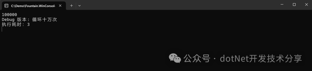 using System.Diagnostics;namespace Fountain.WinConsole.BuildTypesDemo{ internal class Program { static void Main(string[] args) { // 用于計時 Stopwatch stopwatch = new Stopwatch(); stopwatch.Start(); int j = 0; for (int i = 0; i < 100000; i++) { j = j + i; } Console.WriteLine($"{j}");#if DEBUG // 此行代碼僅在選擇 Debug 版本時運(yùn)行。這樣,就可以在不影響 Release 構(gòu)建的情況下添加調(diào)試代碼。 Console.WriteLine("Debug 版本: 循環(huán)十萬次");#endif stopwatch.Stop(); // Console.WriteLine(string.Format("執(zhí)行耗時:{0}", stopwatch.ElapsedMilliseconds)); // Console.Read(); } }}