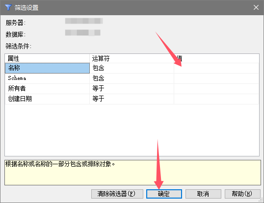 在名稱一行最后單元格上輸入表名的一部分,如“user”,點(diǎn)確定,就能篩選出包含“user”的表了。