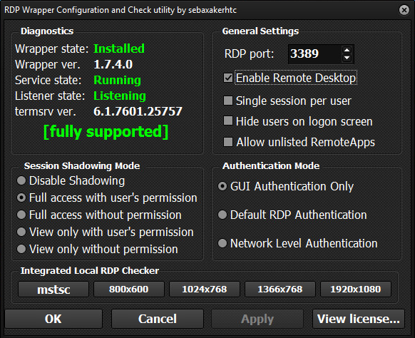 RDP Wrapper Library mod v1.7.4版本號與 Stas'M Corp 的版本沒有任何共同之處,并且更改了版本以查找人們屏幕截圖上的差異,以了解他們真正使用的版本。 該版本的核心是 Stas'M Corp 存儲庫的 v1.6.2。 變化:
