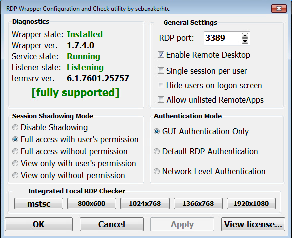 RDP Wrapper Library是一款專業(yè)的Windows系統(tǒng)遠(yuǎn)程桌面的軟件工具,軟件支持遠(yuǎn)程桌面,允許多個用戶同時登錄設(shè)置。非常方便快捷,軟件界面簡約,布局直觀清晰。操作簡單,容易上手,是一款十分實(shí)用的工具。 本地下載附件:rdpwrap-1.8.9.9.rar(可能會被誤報病毒,所以做了加密壓縮處理,解壓密碼:123456) 使用方法解壓后運(yùn)行”RDPW_Installer.exe“文件安裝并將其它文件復(fù)制到”C:\Program Files\RDP Wrapper“目錄下。運(yùn)行“RDPConf“文件檢查遠(yuǎn)程桌面開通情況,若Listener State這后顯示【fully supported】說明遠(yuǎn)程桌面已開始并允許多用戶同時登陸