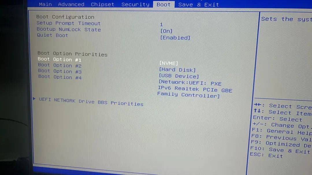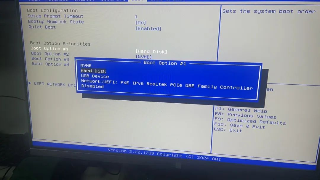 如是就進(jìn)入到BIOS中。選擇Boot Option中,無論是選擇NVME,還是hard Disk都無法引導(dǎo)系統(tǒng)。