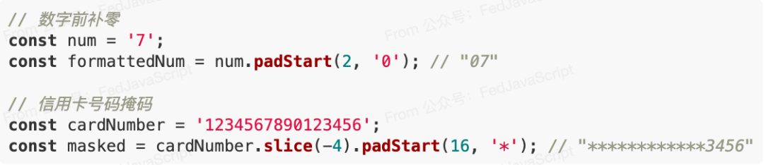4. 字符串填充在處理數(shù)字格式化、創(chuàng)建固定長度的字符串時(shí),padStart()和padEnd()特別有用: