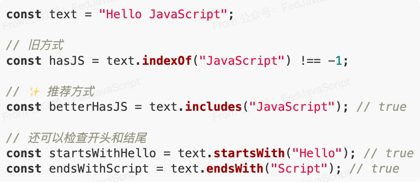5. 字符串搜索的改進(jìn)方案在檢查字符串是否包含特定內(nèi)容時(shí),includes()比indexOf()更直觀: